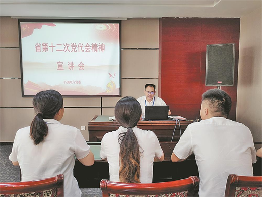 6月22日一早,省黨代表、萬洲電氣股份有限公司黨委書記、副總經理李明輝在黨員活動室向公司黨員宣講黨代會精神。