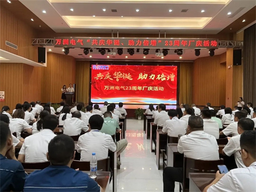 載懽載笑獻賀禮,歡聚一堂慶華誕。9月7日下午,在萬洲電氣一樓多功能廳,伴隨著莊嚴的國歌聲,萬洲電氣23周年廠慶活動拉開帷幕。萬洲電氣黨委書記、副總經理李明輝、副總經理包群英、市場營銷中心副總經理李峰、云川光電總經理趙邦國等領導出席廠慶活動。萬洲電氣、云川光電、襄陽工廠、萬洲機械全體在家員工500余人歡聚一堂,共慶萬洲電氣23周年華誕。