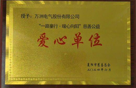 日前,萬洲電氣被襄陽市慈善總會授予“‘一路童行•暖心向陽’慈善公益愛心單位”榮譽稱號。