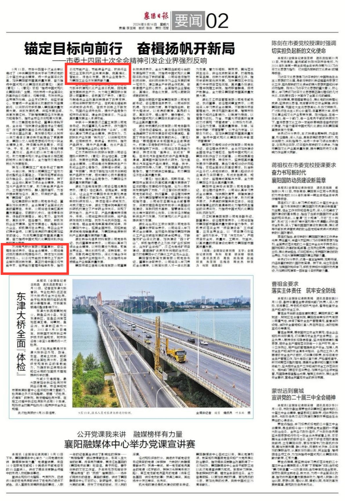 9月11日,市委十四屆十次全會審議通過了《中共襄陽市委關于學習貫徹黨的二十屆三中全會精神、進一步全面深化改革、加快襄陽都市圈高質(zhì)量發(fā)展、奮力推進中國式現(xiàn)代化襄陽實踐的意見》(簡稱《意見》)?!兑庖姟肪o扣“推進中國式現(xiàn)代化襄陽實踐”主題,對我市進一步全面深化改革作出系統(tǒng)謀劃、統(tǒng)籌安排,引發(fā)我市企業(yè)界強烈反響。企業(yè)家們表示,將堅定信心,乘著進一步全面深化改革的東風奮楫前行,以實際行動積極融入襄陽高質(zhì)量發(fā)展大局,共抓發(fā)展機遇、共拓發(fā)展空間、共享發(fā)展紅利,不斷增強襄陽經(jīng)濟發(fā)展活力和競爭力,推動全市經(jīng)濟實現(xiàn)更大發(fā)展。