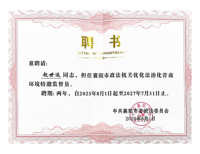 日前,從襄陽政法委獲悉,萬洲電氣董事長、總經理趙世運被市政法機關優化法治化營商環境特邀監督員。