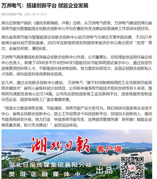 湖北省系統(tǒng)節(jié)能與智慧能源企校聯(lián)合創(chuàng)新中心由萬洲電氣與湖北文理學(xué)院共建,于2021年被湖北省科技廳獲批備案,2025年在新型研發(fā)機構(gòu)績效考核評價中以高分獲評“優(yōu)秀”等次,全省僅40家,襄陽6家。