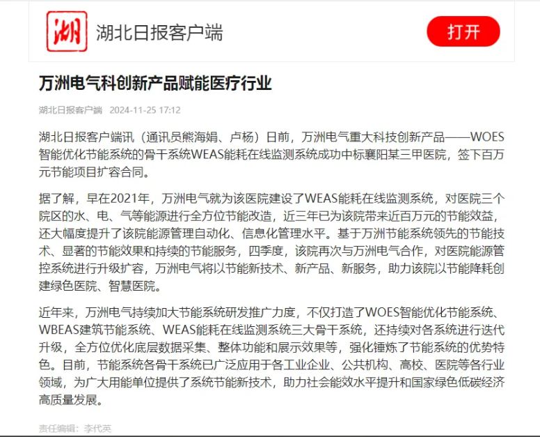 湖北日報客戶端訊(通訊員熊海娟、盧楊)日前,萬洲電氣重大科技創新產品——WOES智能優化節能系統的骨干系統WEAS能耗在線監測系統成功中標襄陽某三甲醫院,簽下百萬元節能項目擴容合同。
