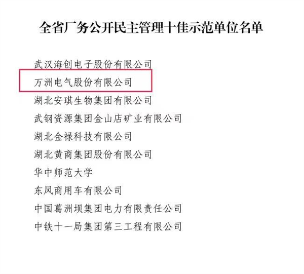 近日,從湖北省總工會獲悉,萬洲電氣被湖北省職工維權與廠務公開工作領導小組評為“全省廠務公開民主管理十佳示范單位”。